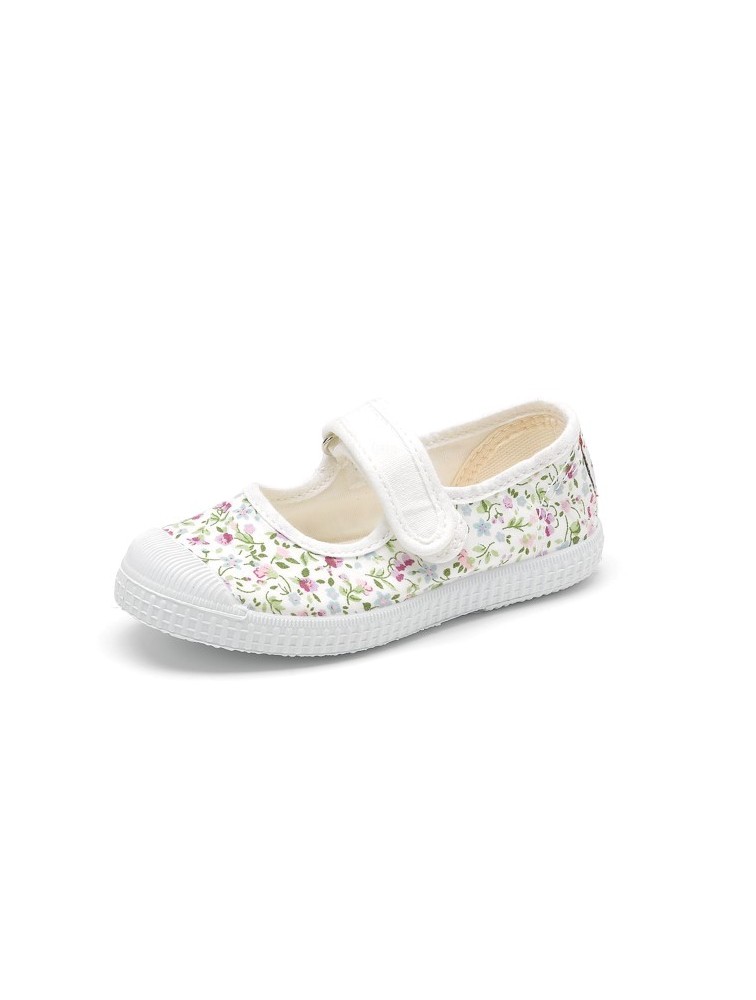 Ballerines Cienta en toile blanche imprimé fleurs à scratch, semelle blanche (Miclaure)