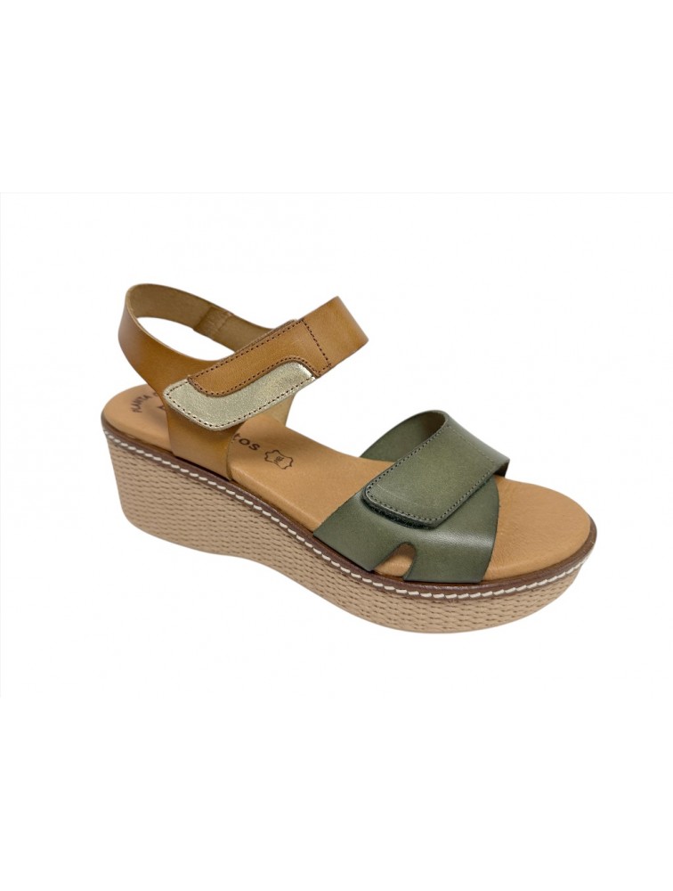 Sandales compensées Eva Frutos femme en cuir bicolore camel et kaki avec brides velcro et détail doré, semelle effet espadrille