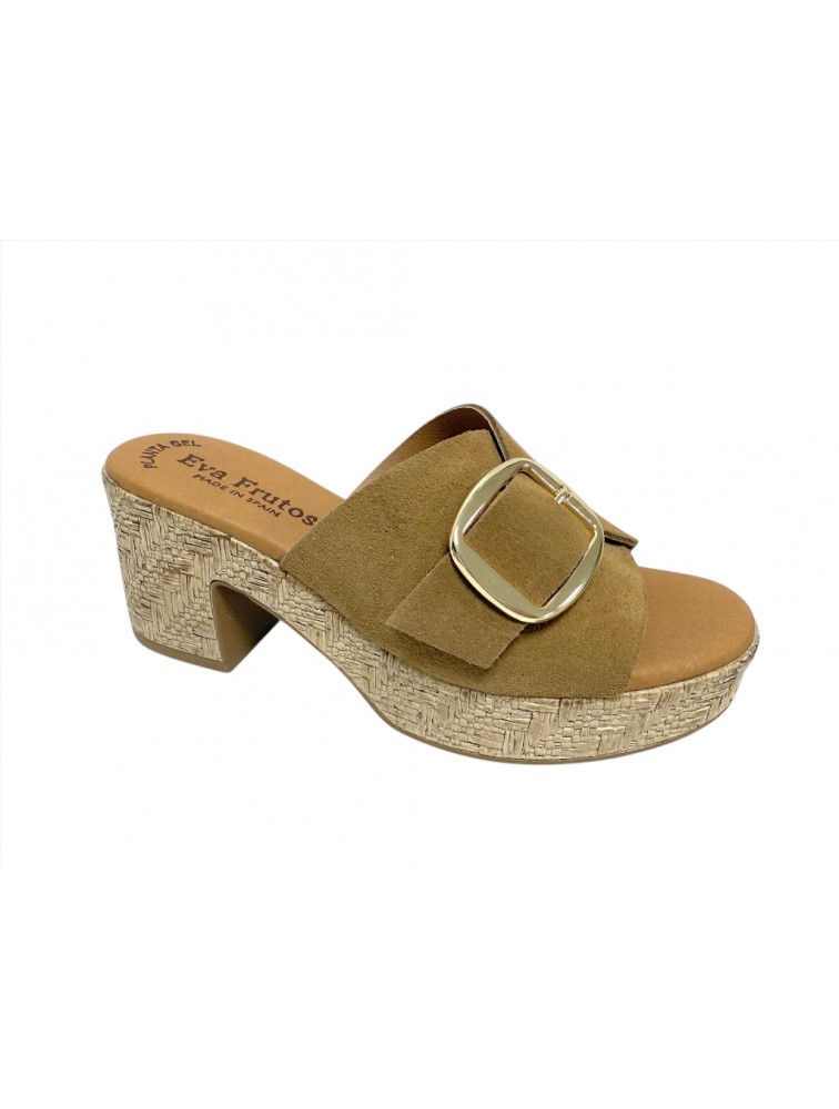 Mules Eva Frutos femme en daim camel avec grande boucle dorée, semelle plateforme et talon épais effet tressé (Miclaure)