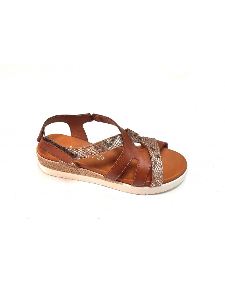 Sandales, compensées, Rael Jordana, femme, cuir, bicolore marron/dorée imitation serpent, bride elastique et scratch (Miclaure)