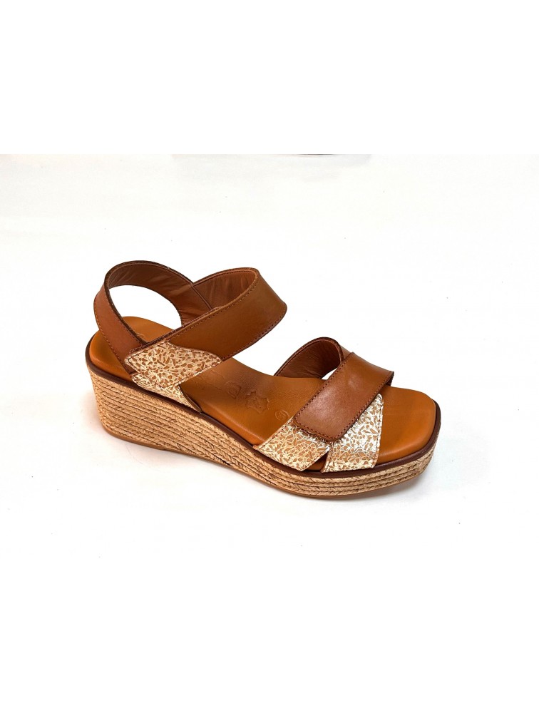 Sandales, compensées, Rael Jordana, femme, cuir, bicolore marron/dorée effet craquelé, bride scratch, réglage scratch devant (Mi