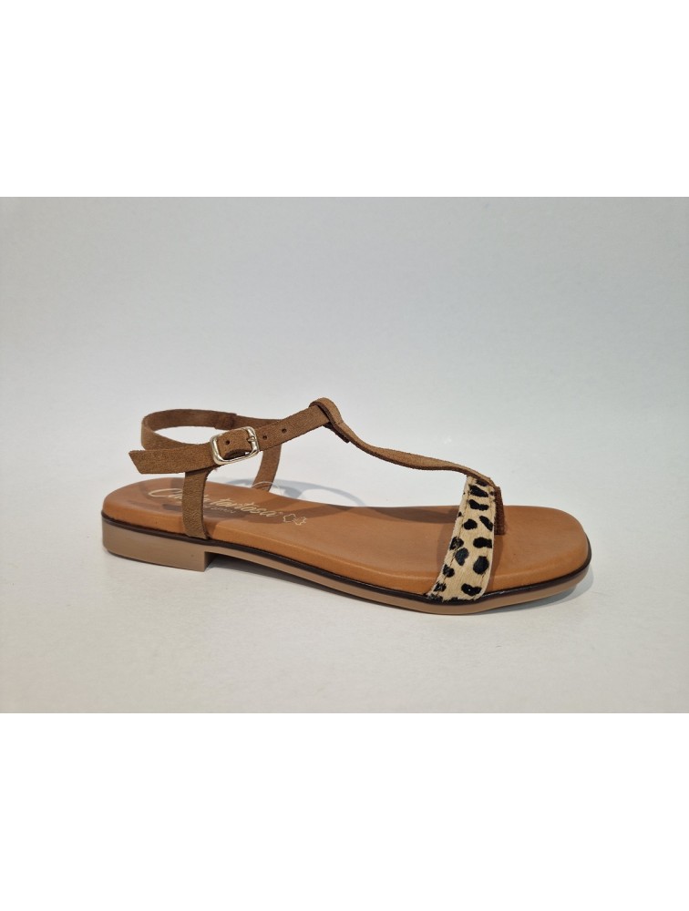 Sandales, Carla Tortosa, femme, cuir brossé, modèle léo, bicolore marron muscade/ imitation léopard, bride boucle avant (Miclaur