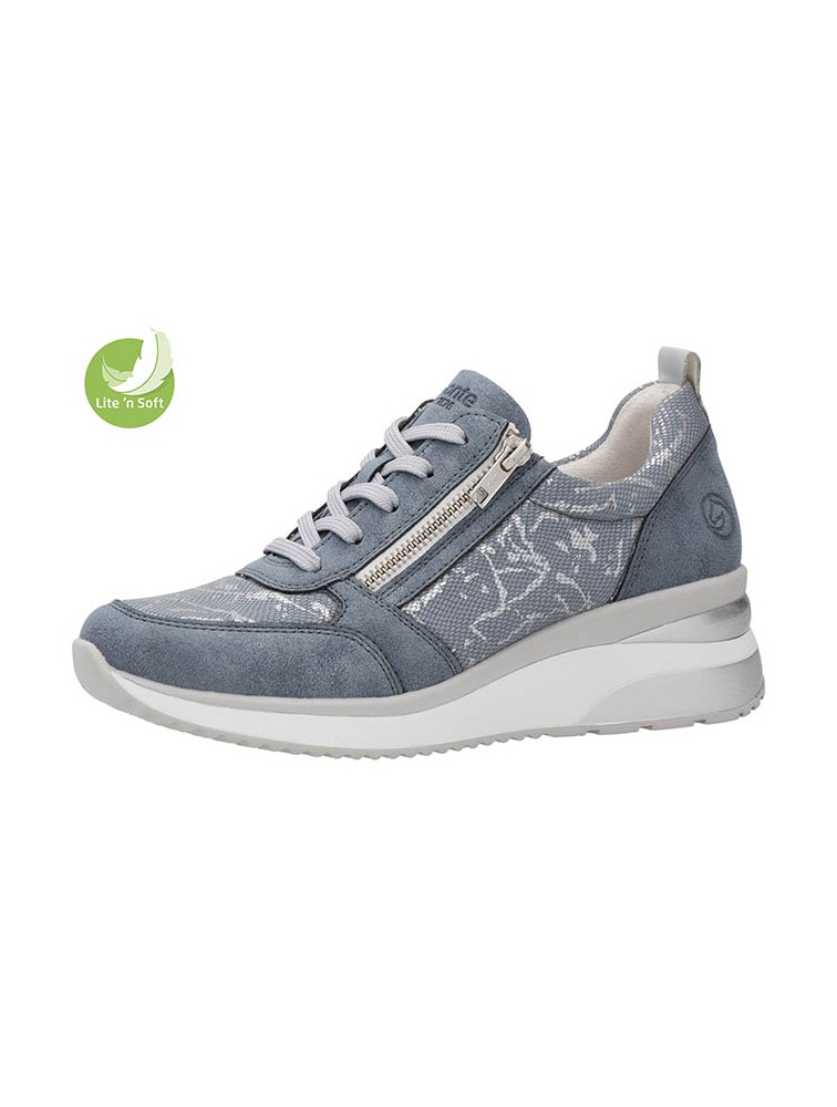 Basket, compensées, Remonte, femme, cuir irisé, tissu imprimé imitation serpent bleu, lacet, zip (Miclaure)