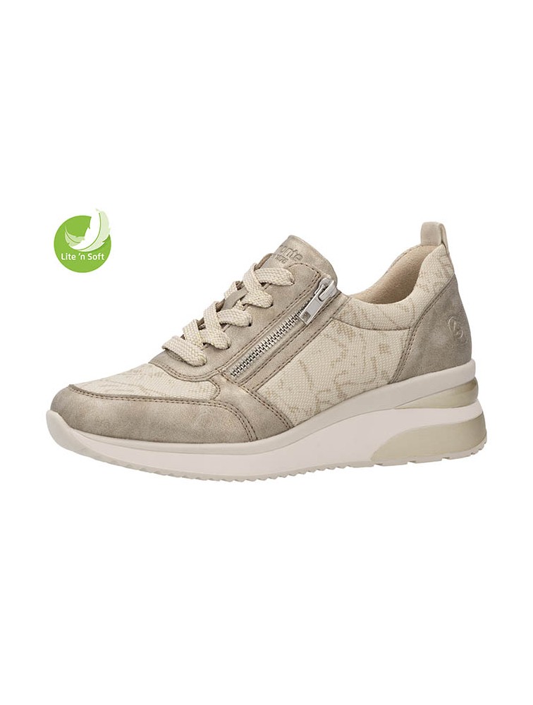 Basket, compensées, Remonte, femme, cuir beige irisé, tissu imprimé imitation serpent beige, lacet, zip (Miclaure)